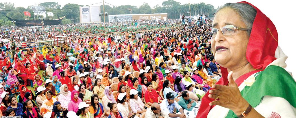 প্রধানমন্ত্রী ও বঙ্গবন্ধু কন্যা শেখ হাসিনা বেলা তিনটার দিকে সমাবেশস্থলে এসে পৌঁছান। ৪টা ২০ মিনিটে বক্তব্য শুরু করেন তিনি। শেষ করেন ৪টা ৫০ মিনিটে। প্রধানমন্ত্রী বক্তব্যের শুরুতেই স্বাধিকার থেকে স্বাধীনতা আন্দোলনে বীর শহীদদের স্মৃতির প্রতি শ্রদ্ধা জানান। স্মরণ করেন ১৯৭৫–এর ১৫ আগস্ট নিহত বঙ্গবন্ধু, তাঁর পরিবারের সদস্য এবং জেলহত্যার শিকার চার জাতীয় নেতাকে।