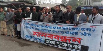 বাংলাদেশ ইয়ূথ ফ্রন্ট ও আমরা সুনামগঞ্জবাসীর ব্যানারে এ মানববন্ধন করা হয়। শুক্রবার বিকাল ৫টায় পাগলা বাজারের কলেজ মার্কেটের সামনে মানববন্ধন করে তারা। খাজুয়া নদী ধল হতে ধনু নদী শাল্লা পর্যন্ত খনন, দিরাই উপজেলার হালেয়া, নাগেরগাও পর্যন্ত বাক সুজা, রত্না নদী হতে গাদিয়ালা পর্যন্ত ও দক্ষিণ সুনামগঞ্জের নাইন্দা নদী খননেরদাবীতে মানববন্ধনে সভাপতিত্ব করেন বাংলাদেশ ইয়ূথ ফ্রন্টের সভাপতি ও চিলাউড়া হলদিপুর ইউনিয়নের সাবেক চেয়ারম্যান রফিকুল ইসলাম খচরু।