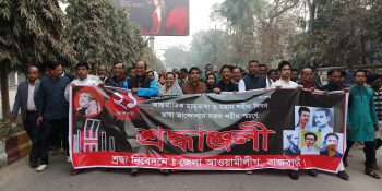 সকালে জেলা আওয়ামীলীগের দলীয় কার্যালয়ে জাতীয় ও দলীয় পতাকা উত্তোলনের মধ্য দিয়ে দিবসটির সূচনা করে জেলা আওয়ামীলীগ। এরপর জেলা আওয়ামী লীগের সাধারন সম্পাদক ও শিক্ষা প্রতিমন্ত্রী, রাজবাড়ী ১ আসনের সংসদ সদস্য কাজী কেরামত আলী নেতেত্বে রাজবাড়ী কেন্দ্রীয় শহীদ মিনারে শ্রদ্ধাঞ্জলী অর্পন করে জেলা আওয়ামীলীগ।এসময় মহিলা আওয়ামী লীগের সভানেত্রী সংরক্ষিত মহিলা আসনের এমপি কামরুন নাহার চৌধুরী লাভলী, যুগ্ন সাধারন সম্পাদক কাজী ইরাদত আলী, পৌর আওয়ামী লীগের সাবেক সভাপতি পৌর মেয়র মোহাম্মদ আলী চৌধুরী সহ জেলা আওয়ামী লীগ ও সহযোগি সংগঠনের নেতাকর্মীরা উপস্থিত ছিলেন।