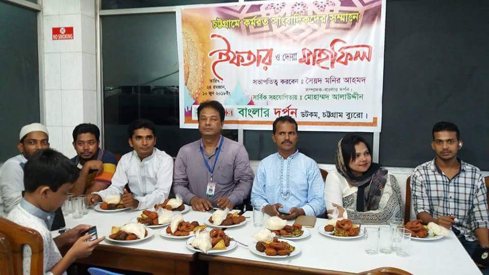বাংলারদর্পন চট্টগ্রাম ব্যুরোর অায়োজনে কাজীর দেউরি জামান রেষ্টুরেন্টে রোববার বিকেলে ইফতার ও দোয়ার মাহফিল অনুষ্ঠিত হয়েছে। অনুষ্ঠানে প্রধান অতিথির বক্তব্যে মহানগর আওয়ামীলীগ নেতা জুলফিকার আলী বলেন, সরকারের অর্জন গুলো ম্লান করে দিতে স্বাধীনতা বিরোধি চক্র তথ্য প্রযুক্তিকে ব্যাবহার করে রাষ্ট্র ও রাষ্ট্রের জনগনের বিরুদ্ধে অপপ্রচার চালিয়ে যাচ্ছে। সরকারের উচিত এখনি শক্ত হাতে এসব দমন করা। সভাপতির বক্তব্যে বাংলারদর্পন সম্পাদক সৈয়দ মনির অাহমদ বলেন, বাংলারদর্পন প্রতিষ্ঠালগ্ন থেকে দেশের সকল শ্রেনী পেশার পাশাপাশি সরকারের উন্নয়ন প্রচারে কাজ করে যাচ্ছে।ভবিষ্যতেও এ ধারা অব্যাহত থাকবে।