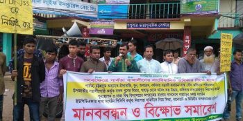 মোশারফ হোসেন, রামগড় : চাঁদাবাজি, খুন, অপহরণ, ধর্ষনসহ সন্ত্রাসী কার্যক্রম বন্ধে যৌথ অভিযান পরিচালনা, উপজাতীয় সন্ত্রাসীগোষ্ঠী কর্তৃক ইতিপূর্বে সংগঠিত সকল খুনের বিচার, রামগড়ে উপজাতীয় সন্ত্রাসীগোষ্ঠী কর্তৃক বেদখলকৃত ভূমি দখলমুক্ত করা, পাহাড় থেকে অবৈধ অস্ত্র উদ্ধারে সাড়াশি অভিযান পরিচালনা, প্রত্যাহারকৃত সকল নিরাপত্তা বাহিনীর ক্যাম্প পুনঃ স্থাপন, ও ঢাকা বিশ্ববিদ্যালয়ের অপরাজেয় বাংলার পাদদেশে ইউপিডিএফ’র শাখা পিসিপি কর্তৃক নিরাপত্তাবাহিনী ও বাঙ্গালী নিয়ে মিথ্যা, বানোয়াট, উস্কানীমুলক অপপ্রচারের প্রতিবাদে আজ শনিবার সকাল ১০ টায় রামগড় বিদুৎ অফিসের সামনে পার্বত্য বাঙ্গালী ছাত্রপরিষদ, রামগড় উপজেলা শাখার উদ্যেগে মানববন্ধন ও বিক্ষোভ সমাবেশ অনুষ্ঠিত হয়।