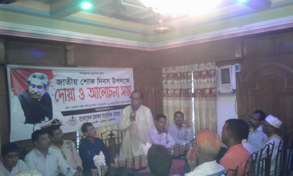 ফেনী প্রতিনিধি : জাতীয় শোক দিবস উপলক্ষে কেন্দ্রীয় কর্মসুচির অংশ হিসেবে বাংলাদেশ মফস্বল সাংবাদিক ফোরাম ফেনী জেলা কমিটির অায়োজনে আলোচনা সভা ও দোয়া মাহফিল অনুৃষ্ঠিত হয়েছে। রবিবার বিকাল ৪টায় ফেনী ফাইভ স্টার হোটেলে অনুৃষ্ঠিত সভায় প্রধান অতিথি ছিলেন, জেলা কমিটির প্রধান উপদেষ্টা ও জজকোর্টের জিপি বীর মুক্তিযোদ্ধা এডভোকেট প্রিয় রঞ্জণ দত্ত। তিনি বলেন, বঙ্গবন্ধু উদার মনের মানুষ ছিলেন।অনেক আগেই খুনিদের ষড়যন্ত্রের বিষয়ে তিনি জানতেন কিন্তু কোন ব্যাবস্থা নেননি।