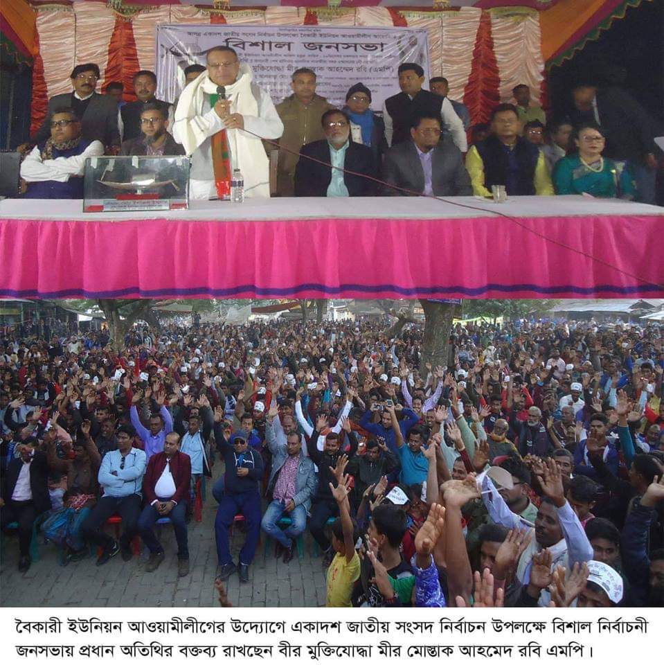 শেখ আমিনুর হোসেন,সাতক্ষীরা ব্যুরো চীফ: আসন্ন একাদশ জাতীয় সংসদ নির্বাচন উপলক্ষে বৈকারী ইউনিয়নে এমপি রবির পক্ষে বিশাল নির্বাচনী জনসভা অনুষ্ঠিত হয়েছে। মঙ্গলবার বিকালে সদরের বৈকারী ইউনিয়ন আওয়ামীলীগের আয়োজনে ইউনিয়ন আওয়ামীলীগের কার্যালয়ের সামনে বৈকারী ইউনিয়ন আওয়ামীলীগের বৈকারী ইউনিয়ন আওয়ামীলীগের ভারপ্রাপ্ত সভাপতি মো. কাওছার আলী’র সভাপতিত্বে বিশাল নির্বাচনী জনসভায় প্রধান অতিথি হিসেবে বক্তব্য রাখেন প্রধান অতিথি হিসেবে বক্তব্য রাখেন জেলা আওয়ামীলীগের সিনিয়র সহ-সভাপতি গণমানুষের প্রাণের নেতা সদর আসনের সংসদ সদস্য বীর মুক্তিযোদ্ধা মীর মোস্তাক আহমেদ রবি।