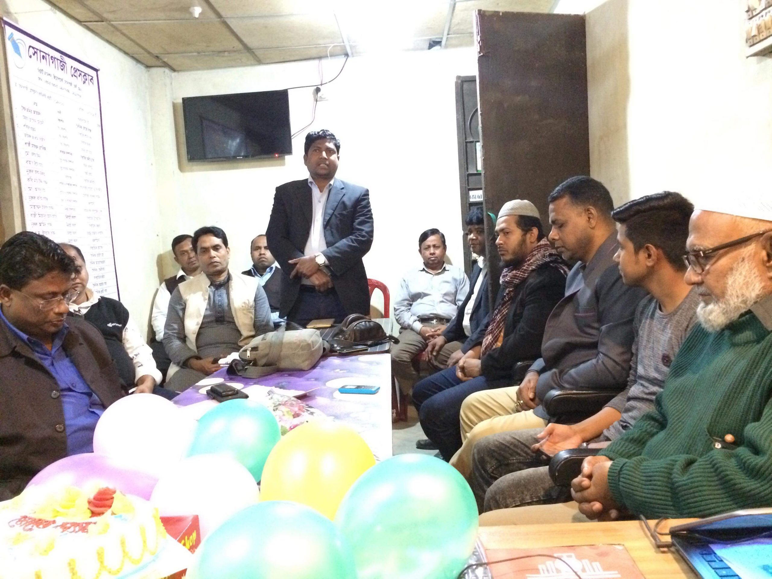 ভোরের কাগজের প্রতিনিধি ও সোনাগাজী প্রেসক্লাব সভাপতি সৈয়দ মনির আহমদ’র সভাপতিত্বে ও সোনাগাজী রিপোর্টার্স ইউনিটির সাধারন সম্পাদক মো. ইকবাল হোসাঈনের সঞ্চালনায় অনুষ্ঠানে বক্তব্য রাখেন, জেলা আ’লীগ নেতা ডা. গোলাম মাওলা, ক্যাপ্টেন (অব.) বীর মুক্তিযোদ্ধা মো. সাদেক, এডভোকেট হাছান মাহমুদ মামুন, উপজেলা সরকারি প্রাথমিক শিক্ষক সমিতির সভাপতি হুমায়ুন কবির সেলিম, সোনাগাজী কেন্দ্রীয় বঙ্গবন্ধু পরিষদ সাধারন সম্পাদক নুর আলম মিস্টার, পৌর আ’লীগ সাধারন সম্পাদক আবু তৈয়ব বাবুল,
