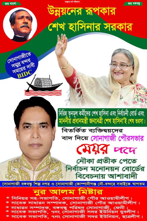 পৌর আ’লীগের সাবেক সভাপতি শেখ নুরুল হুদা ও ওয়ার্ড নেতাদের দাবী সোনাগাজী পৌর নির্বাচনে মেয়র পদে দলীয় মনোনয়ন পাওয়ার যোগ্য,ত্যাগী, সুশিক্ষিত, ভদ্র, ক্লিনম্যান ও কর্মীবান্ধব নেতা নুর আলম মিস্টার ।