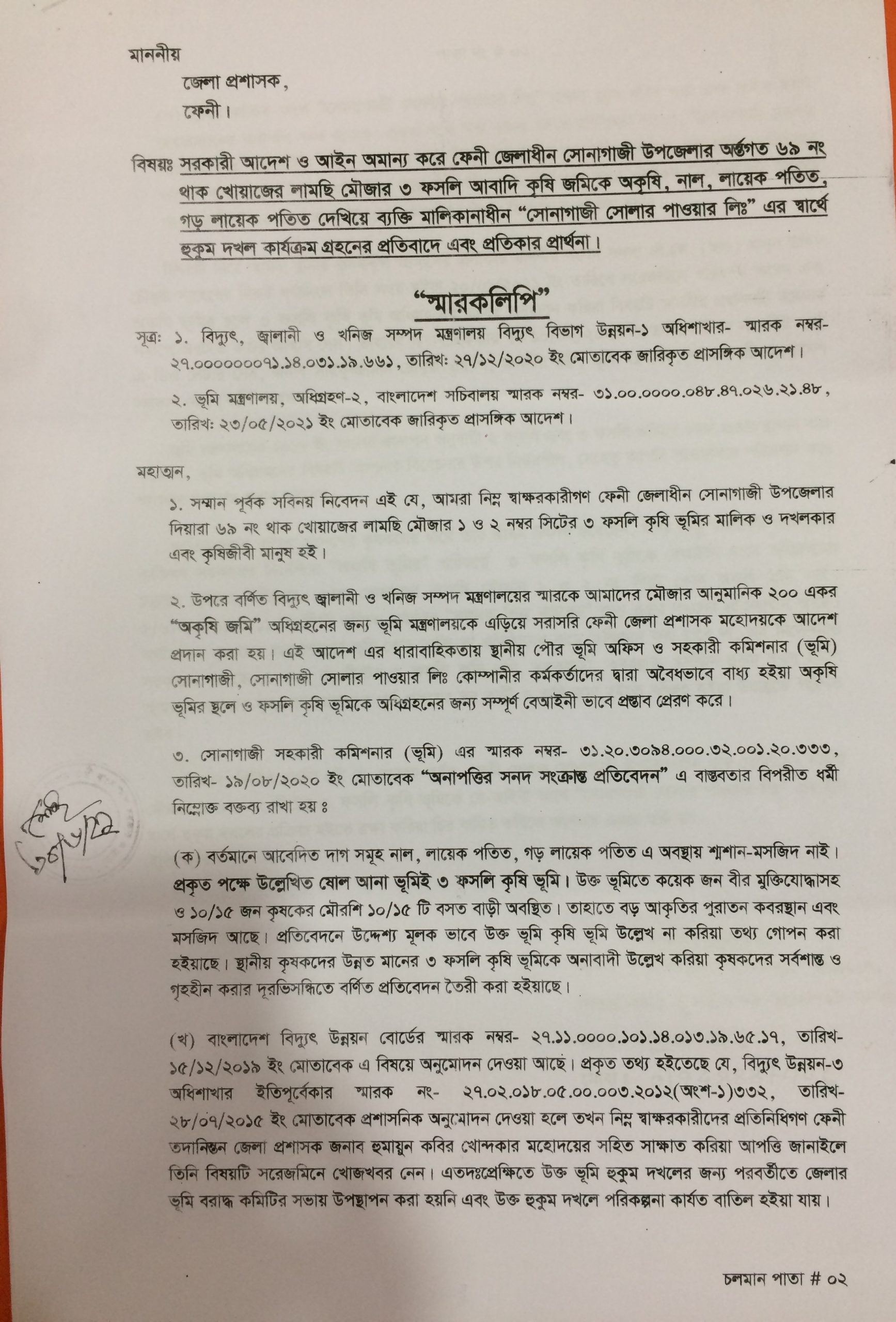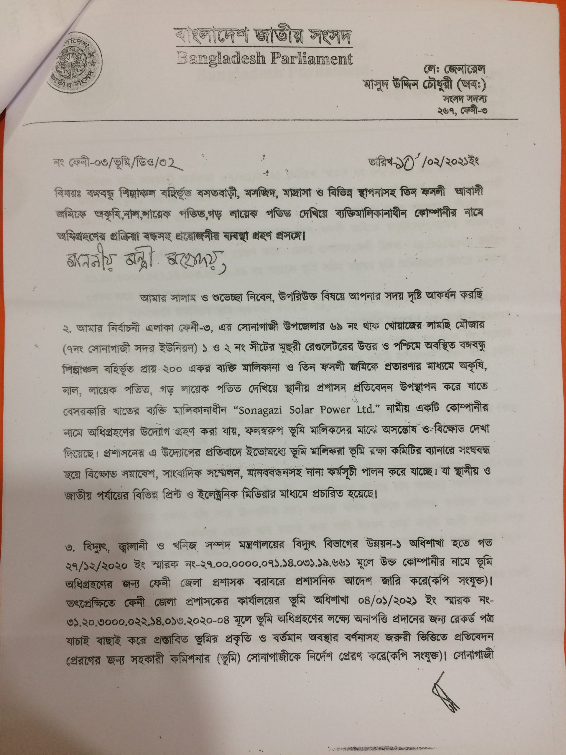 ‘সোনাগাজী সোলার পাওয়ার লিমিটেড’ নামে একটি নাম সর্বস্ব কোম্পানীর নামে উপজেলার থাক খোয়াজের লামছি মৌজায় অবৈধভাবে দুইশ একর ভূমি অধিগ্রহনের পায়তারা করা হচ্ছে। প্রতিকার চেয়ে বুধবার জেলা প্রশাসকের কাছে স্বারকলিপি দিয়েছেন শতাধিক ভূমি মালিক। তদন্তপূর্বক প্রয়োজনীয় ব্যবস্থা নেয়ার আশ্বাস দেন জেলা প্রশাসক আবু সেলিম মাহমুদ উল হাসান।