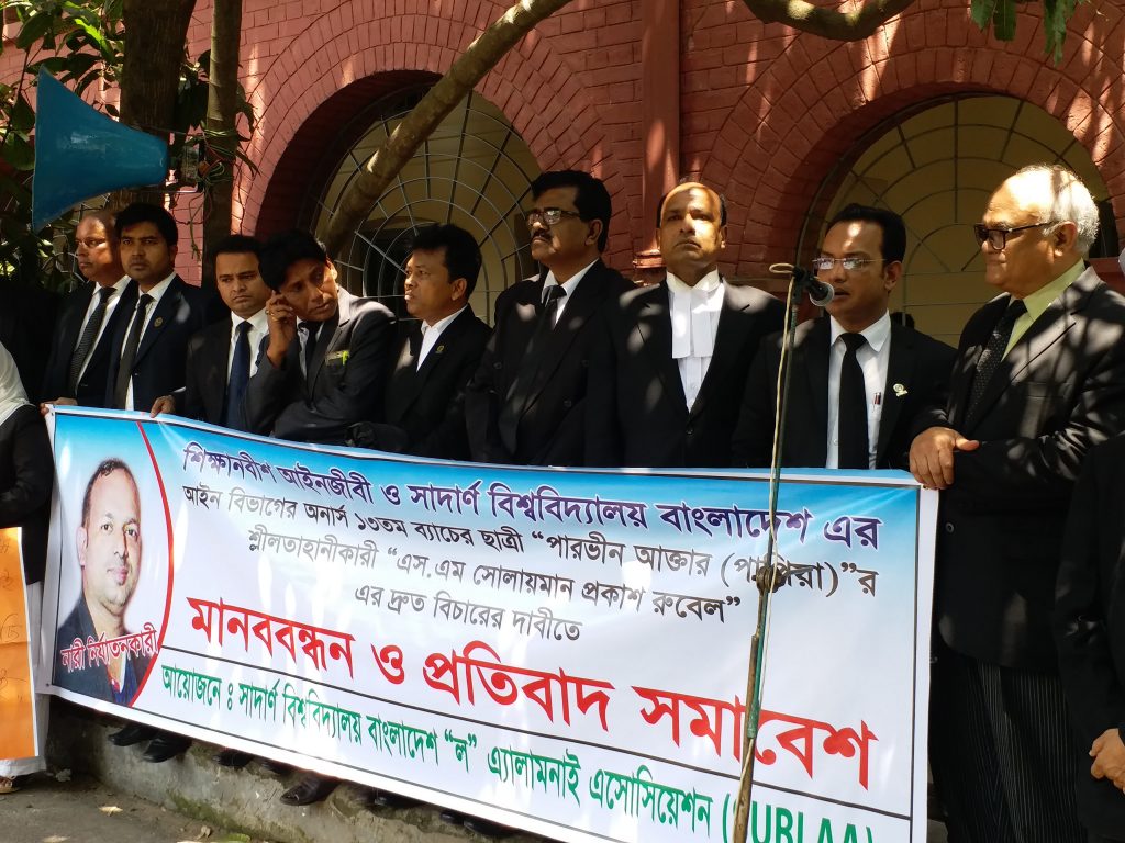 শিক্ষানবীশ আইনজীবীর উপর হামলার প্রতিবাদে মানববন্ধন ও প্রতিবাদ সমাবেশ অনুষ্ঠিত সাদার্ন বিশ্ববিদ্যালয় বাংলাদেশ এর অনার্স ১৩ তম ব্যাচের ছাত্রী ও শিক্ষানবীশ আইনজীবী পারভীন আক্তার পাপিয়া’র উপর ন্যক্কারজনক সন্ত্রাসী হামলা ও শ্লীলতাহানীর প্রতিবাদে ঝটইখঅঅ কর্তৃক পূর্ব ঘোষিত “মানবন্ধন ও প্রতিবাদ সমাবেশ” অদ্য কোর্টহিলস্থ শহীদ মিনার প্রাঙ্গণে ঝটইখঅঅ’র সাধারণ সম্পাদক অ্যাডভোকেট মো: আরিফুর রহমান এর সঞ্চালনায় এবং অ্যাডভোকেট মো: শামীম এর সভাপতিত্বে অনুষ্ঠিত হয়। উক্ত সভায় অন্যান্যদের মধ্যে বক্তব্য রাখেন ঝটইখঅঅ’র সাবেক সভাপতি অ্যাড.মো: রাশেদুল আলম রাশেদ, প্রেসিডিয়াম মেম্বার অ্যাড. মো: তসলিম উদ্দিন, অ্যাড. মীর মোয়াজ্জেম হোসেন অভি, অ্যাড. আবদুল্লাহ আল বেলাল, অ্যাড.কাজী শোয়াইব-উর-রশিদ সিদ্দিকী, অ্যাড.মো: দেলোয়ার হোসাইন, যুগ্ম সাধারণ সম্পাদক অ্যাড. শ্যামল চৌধুরী, সাংগঠনিক সম্পাদক অ্যাড. মোমেনুর রহমান, সহ সাধারণ সম্পাদক রাইসুল কবির হিমুন, চট্টগ্রাম মহানগর স্বেচ্ছাসেবক লীগের আহ্বায়ক অ্যাড. এ.এইচ.এম জিয়া উদ্দিন, অ্যাড.আনোয়ার হোসেন আজাদ, সাবেক জেলা পিপি অ্যাড. মো: আবুল হাসেম, চট্টগ্রাম জেলা আইনজীবী সমিতির সাবেক সহ-সাধারণ সম্পাদক ও সাবেক মহানগর পিপি অ্যাড. আব্দুস ছাত্তার, অ্যাড. আব্দুস ছাত্তার সরোয়ার, সাবেক সাধারণ সম্পাদক অ্যাড. অশোক কুমার দাশ, অ্যাড. শেখ ইফতেখার সাইমুল চৌধুরী, অ্যাড. মো: হুমায়ুন কবির রাসেল, সিনিয়র অ্যাড. এ.এস.এম বদরুল আনোয়ার, সাবেক সভাপতি অ্যাড. মো: কফিল উদ্দিন, বর্তমান সাধারণ সম্পাদক অ্যাড.মো: আবু হানিফ, বর্তমান সভাপতি অ্যাড. বাবু রতন কুমার রায় প্রমুখ। সভায় বক্তারা অবিলম্বে হামলাকারী এস.এম সোলায়মান প্রকাশ রুবেল এর দ্রুত বিচার নিষ্পত্তি ও সর্বোচ্চ শাস্তির দাবী জানান।