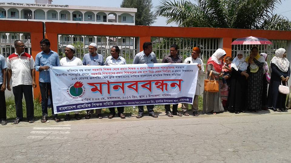 মোঃ ইমাম উদ্দিন সুমন, নোয়াখালী প্রতিনিধি:বাংলাদেশ প্রাথমিক শিক্ষক সমিতি কেন্দ্রীয় কমিটির ঘোষিত কর্মসূচি অনুযায়ী সুবর্ণচর উপজেলা পরিষদ সামনে বাংলাদেশ প্রাথমিক শিক্ষক সমিতি সুবর্ণচর শাখার আয়োজনে সরকারি প্রাথমিক বিদ্যালয়ের বন্ধ থাকা সহকারি শিক্ষক থেকে প্রধান শিক্ষকের দ্রুত পদোন্নতি প্রদানসহ শতভাগ পদোন্নতি দ্রুত বাস্তবায়ন, সহকারি শিক্ষকদের বেতন স্কেল প্রধান শিক্ষকগনের বেতনস্কেলের এক ধাপ নিচে নির্ধারণ করে প্রধান শিক্ষকগণের ১০ম গ্রেডে বেতনস্কেল প্রদান করে ক্রসপডিং স্কেল প্রদানের দাবীতে এক মানববন্ধন কর্মসূচি মঙ্গলবার ১১ ঘটিকায় অনুষ্ঠিত হয়। এতে বক্তব্য রাখেন সমিতির সুবর্ণচর শাথার সভাপতি জনাব মোঃ শাখাওয়াত উল্যাহ, সহ-সভাপতি জনাবা আলেয়া বেগম, সাধারন সম্পাদক মোহাম্মদ নাছিম ফারুকী, যুগ্ম সাধারন সম্পাদক জনাব মোঃ রাশেদ আনোয়ার হোসেন প্রমুখ।